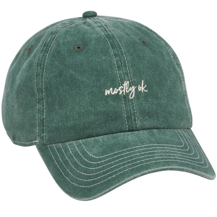 Mostly Okay: Anyone else done with keeping every little thought to themselves? This green baseball cap displays a relatable sentiment that reads "Mostly Ok" in a hand written style for honest self-expression. Stylish design is fully embroidered on stonewashed cotton for a naturally worn look. Questionables baseball caps are one size fits most with an adjustable buckle closure to create the perfect fit. Hand wash only. Our Mostly Ok baseball cap is perfect for everyday expression.