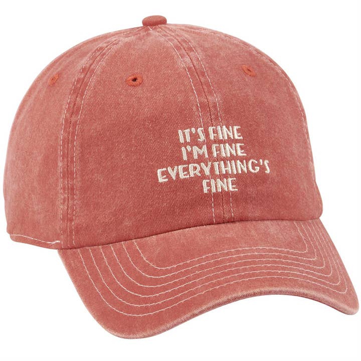 It's Fine: Saying something three times makes it true, right? This vibrant baseball cap displays a relatable sentiment that reads "It's Fine, I'm Fine, Everything's Fine" in a bold style. Stylish design is fully embroidered on stonewashed cotton for a naturally worn look. Questionables baseball caps are one size fits most with an adjustable buckle closure to create the perfect fit. Hand wash only. Our It's Fine baseball cap demands attention making it perfect for everyday expression.