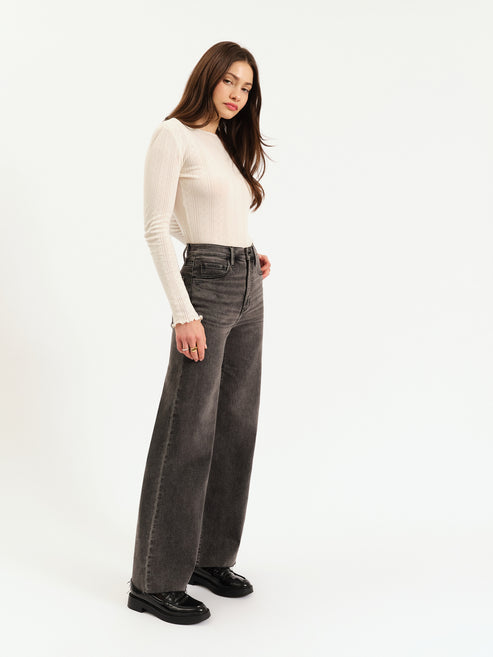 The Far Out in Milky Way is a high rise wide leg jean in a vintage-inspired faded black wash. This reliably flattering pair features a waist-cinching high rise and dramatic wide legs.