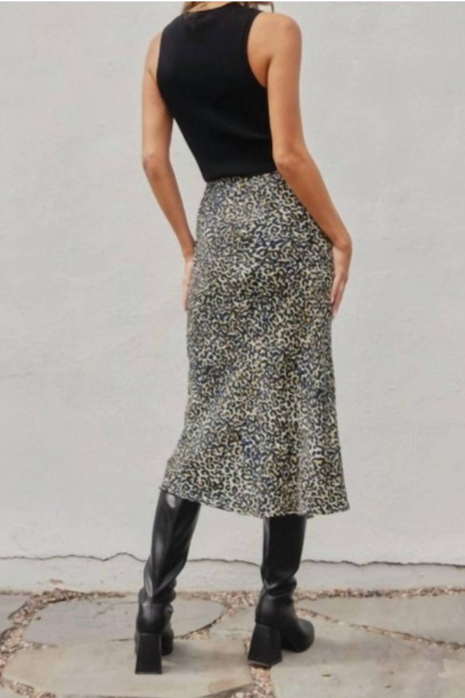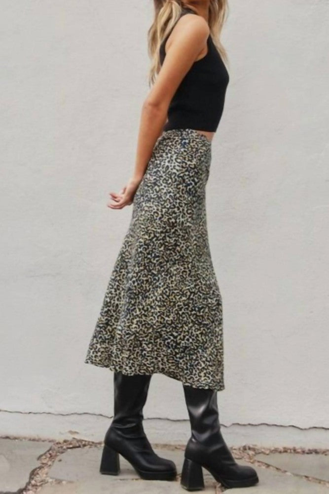 Animal print A-line midi skirt. Model is 5'9" and wearing size Small. - A-line - Bias cut - Elasticated back band - Hidden back zipper closure - 31 inch total length (size small) - Unlined Shell: 85% Rayon, 15% Nylon