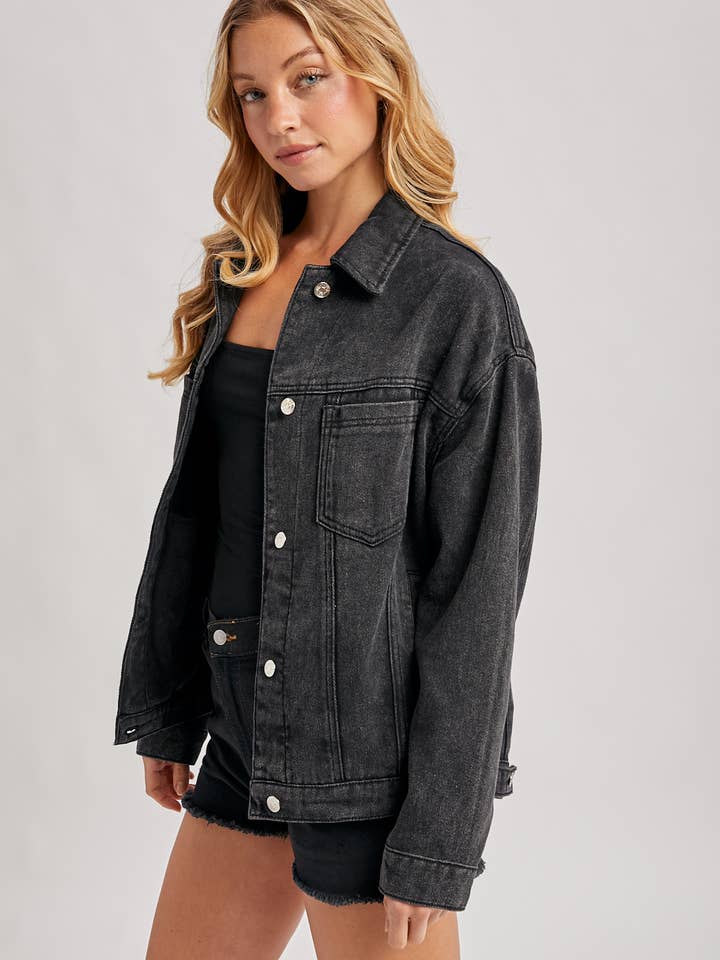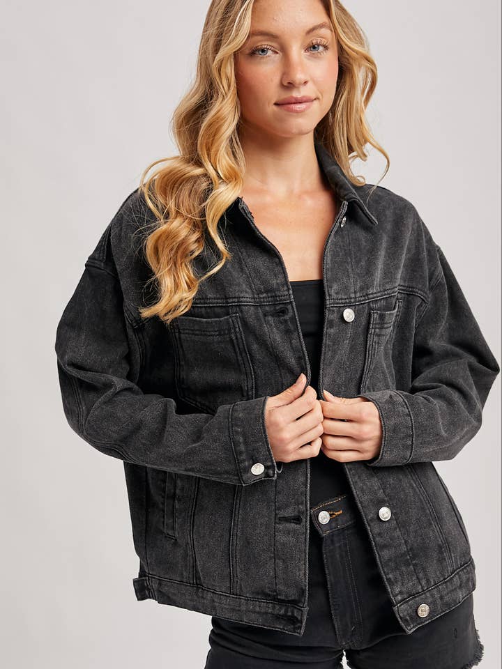 The denim button-down oversized jacket is a timeless and versatile piece that adds a touch of casual chic to any outfit. Crafted from durable denim fabric, it offers both style and functionality. The oversized silhouette provides a relaxed and effortless vibe, perfect for layering over a variety of tops and dresses. With its classic button-down front and spacious pockets, this jacket combines practicality with fashion-forward design. Whether worn with jeans for a denim-on-denim look or thrown over a floral dress for a juxtaposition of styles, the denim button-down oversized jacket is a wardrobe essential for any season.