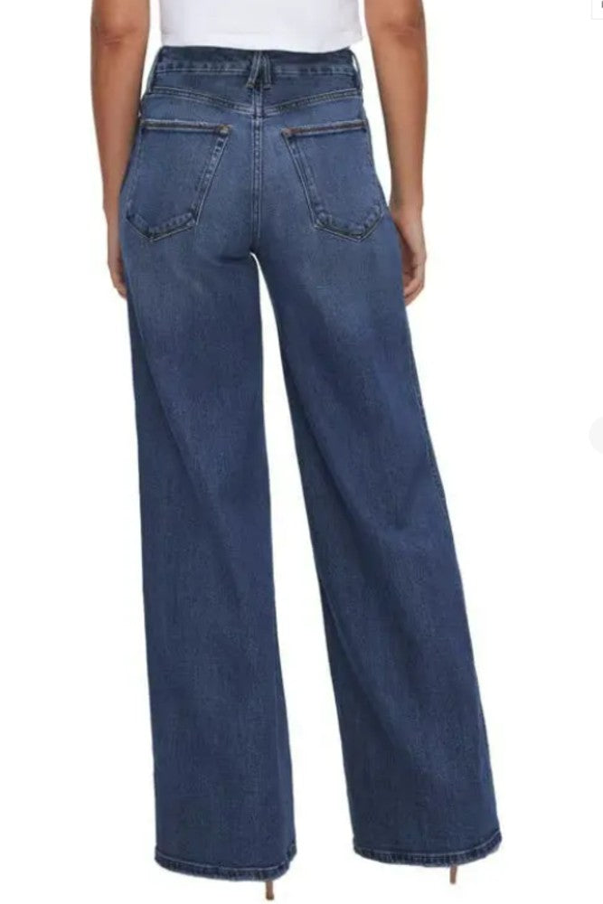 These Good American wide leg jeans are crafted from 69% cotton, 30% lyocell, and 1% elastane. These high rise jeans feature a looser fit, full length legs and a low-stretch construction. They have a 31" inseam, 22" leg opening, 11 1/2" front rise, and 13" back rise (size 2).