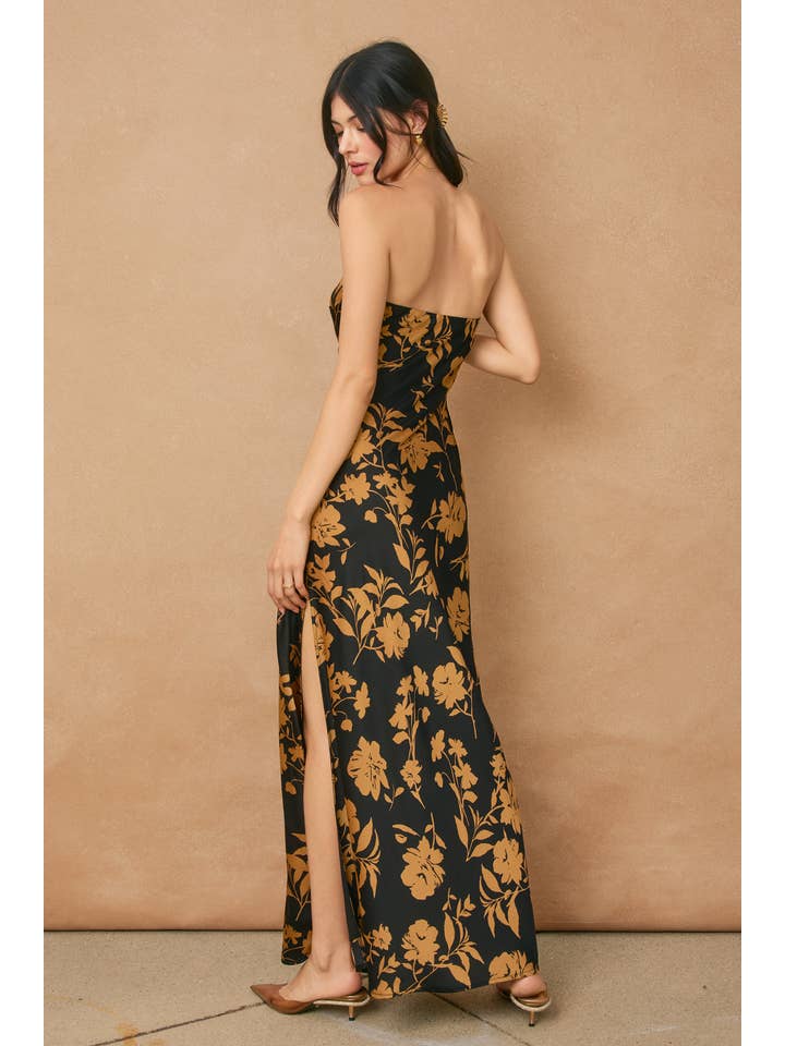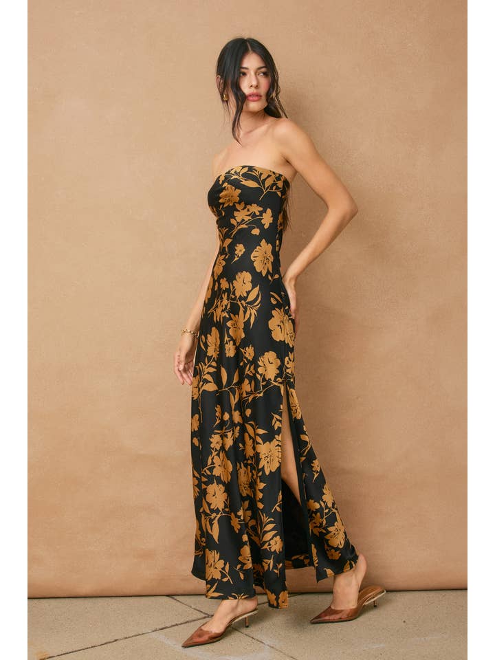 Floral print chiffon strapless maxi dress. Model is 5'8" and wearing size Small.