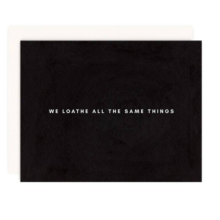We Loathe All: We Loathe All The Same Things greeting card. Because life is even more fun when you find someone to be bitchy with. Single blank interior greeting card with matching ivory envelope.