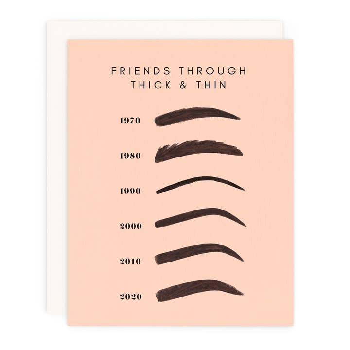 Thick & Thin: Friends Through Thick & Thin greeting card. For your way-back friends and the brow-obsessed alike. Single blank interior greeting card with matching ivory envelope. Bestseller!