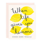 Life Gives Lemons: When Life Gives You Lemons, Chase Some Tequila greeting card. Always stay positive (and/or slightly buzzed). Single blank interior greeting card with matching blush envelope