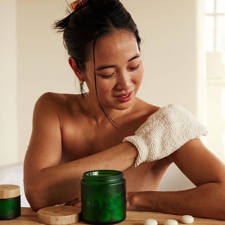 Enhance your shower or bath experience with our textured Body Mitt, which provides gentle yet invigorating full body exfoliation. Made from 100% bamboo, the natural fibers effectively clear dead skin cells, remove impurities, and unblock hair follicles, allowing moisture to be drawn in the skin more easily. Pair with The Pebble for a deep-conditioning body treatment.