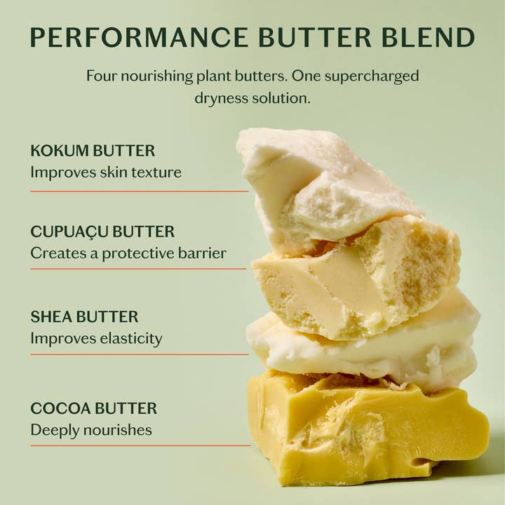 Performance Butter Blend: This powerhouse blend of pure plant butters—cocoa, shea, cupuaçu, and kokum—provides unmatched nourishment and protection. It'll replace every other balm in your bag.