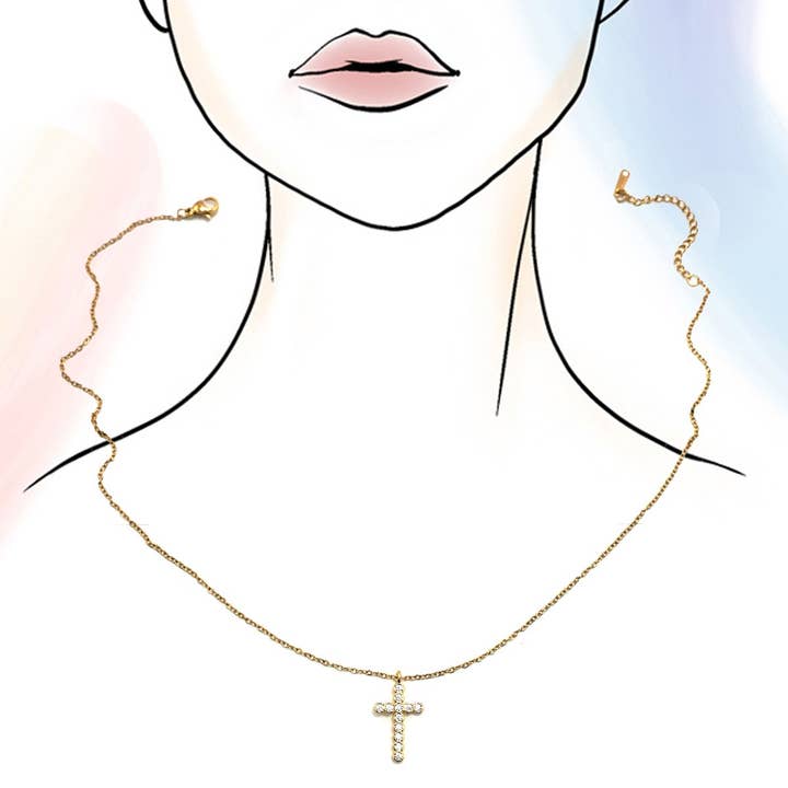 18K Stainless Steel Tarnish-Free Rhinestone Cross Necklace is beautifully combines faith and fashion. Crafted from high-quality stainless steel with an 18K gold finish, this necklace is designed to resist tarnish and maintain its lasting shine. The delicate cross pendant is adorned with sparkling rhinestones, adding a touch of brilliance and sophistication. Perfect gift for the holidays, including Christmas, Mother's Day, Valentine's Day, Easter.
