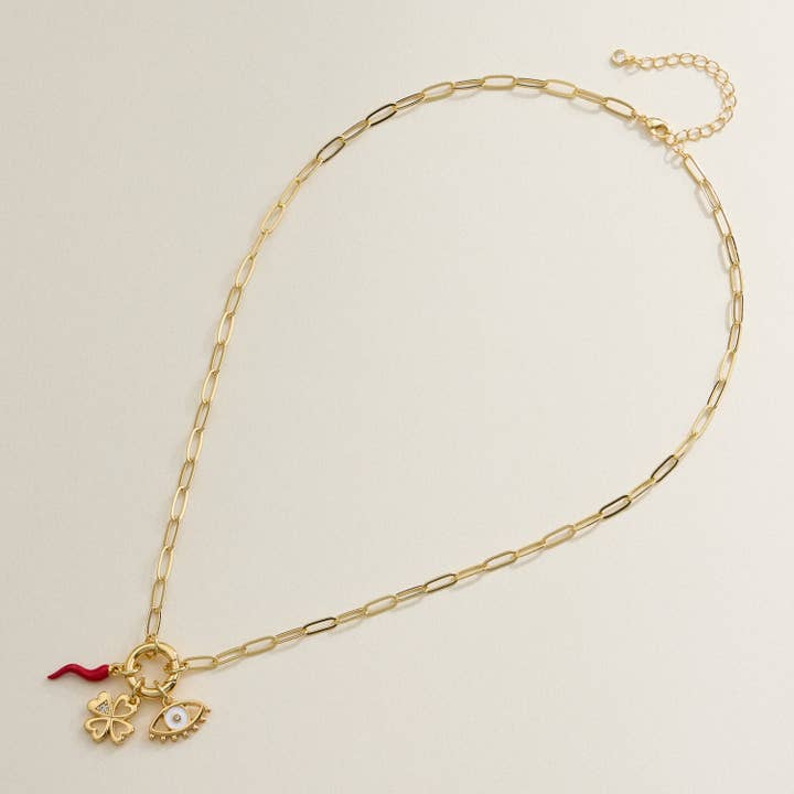 Channel good fortune and powerful protection with the Protect & Prosper charm necklace. This 18K gold dipped piece features three symbolic charms: a red chili pepper for warding off negativity, a four-leaf clover for good luck, and an evil eye for spiritual defense. Suspended from a bold paperclip chain with a central ring, this necklace is a meaningful statement piece—also available in silver with an adjustable fit. approx. 16+2in