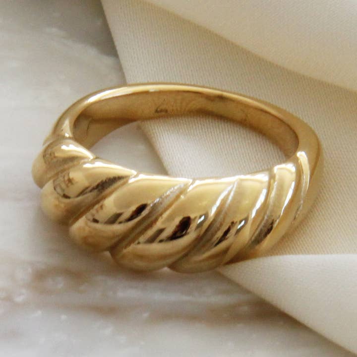 Our beautiful Croissant Ring makes a perfect statement piece to be worn alone or layered with other rings. This listing is for one (1) ring. • Measurements: 8mm • Material: 18K gold over surgical steel or polished surgical steel. • Waterproof, tarnish resistant, nickel and lead free