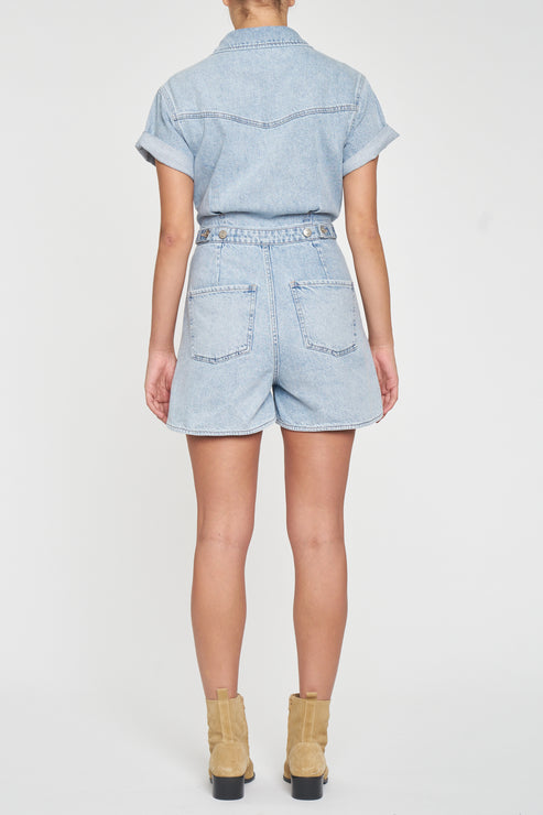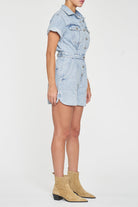 A brand new addition to Daze - a denim romper. Created from a non stretch fabric, this romper features a snap front with a curve defining elastic waist.