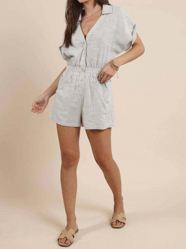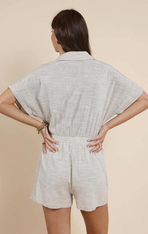 The perfect outfit choice when you you need something quick to throw on and still want to look efforlessly cool. Elevate your summer wardrobe with the Mojave Button Romper by Sadie & Sage, perfect for a beach getaway. Crafted from a self blend of 70% Cotton, 25% Rayon, and 5% Linen, this romper features a pinstripe pattern and a convenient scrunch waistband. The button-up front adds a touch of sophistication, while the pockets offer practicality. Lined with 92% Polyester and 8% Spandex for comfort, this piece comes in a chic Black Ivory color.