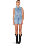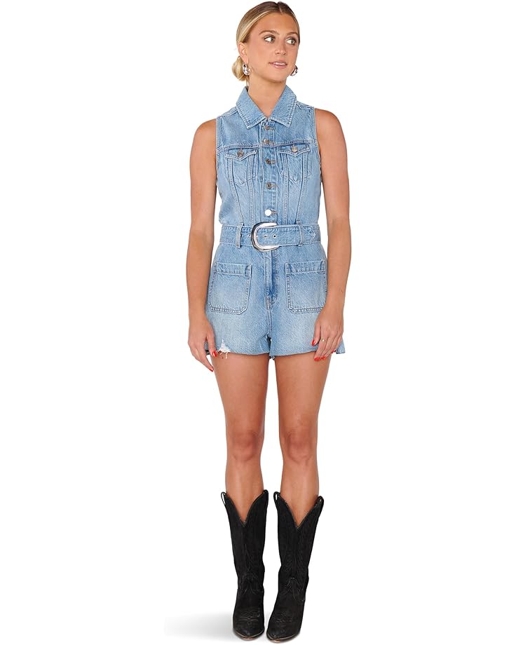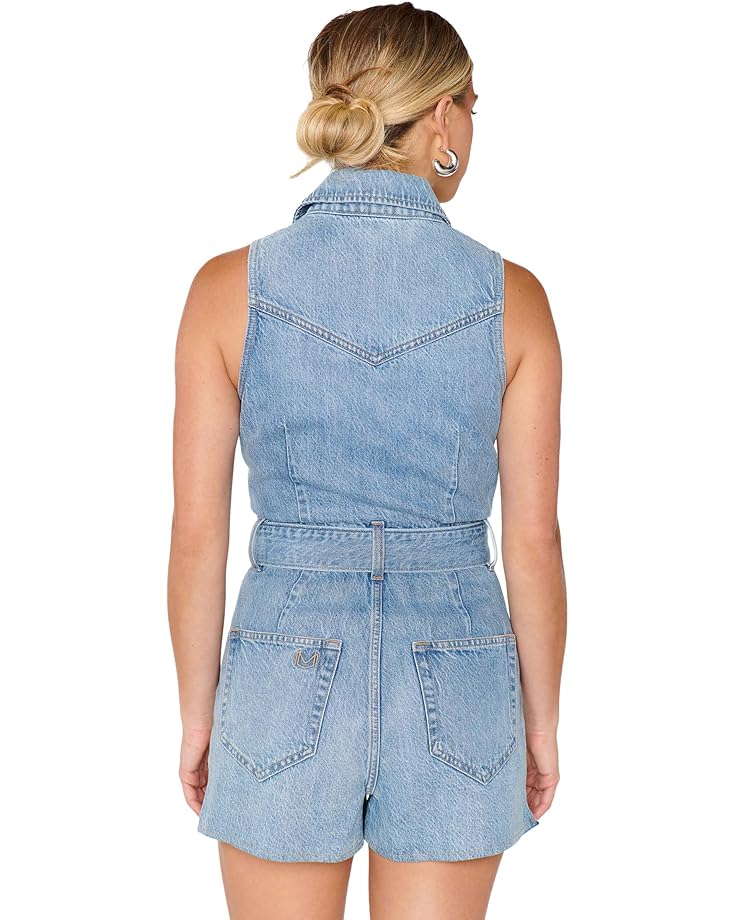- The new fav Show Me Your Mumu™ Rancho Mirage Romper is here! The Rancho Mirage has a vest top look with a collared neckline, front button closure, cute chest pocket front detail. Clean hem with matching belt gives her a polished look. It comes with two front hand pockets, two back pockets, and mid-rise silhouette.