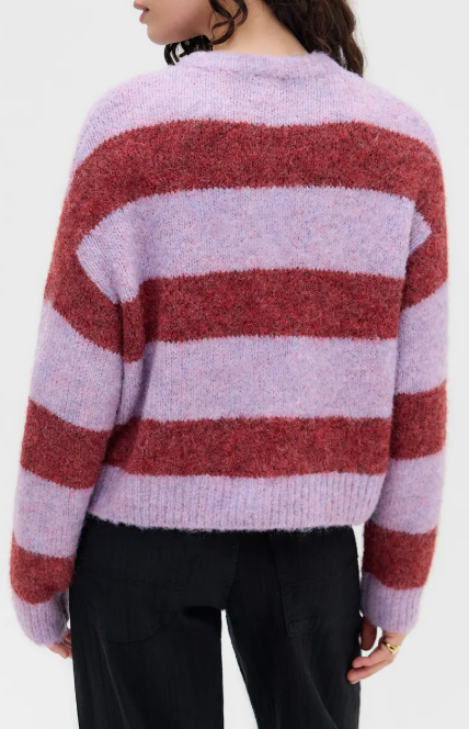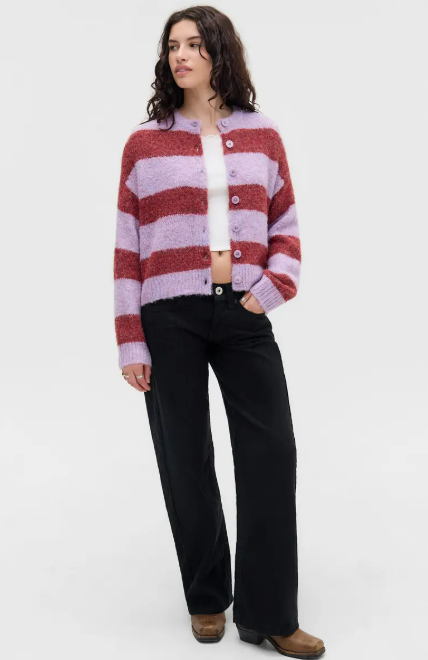 Bold rugby-style stripes wrap around a fuzzy cardigan knit from a wool-kissed yarn blend.