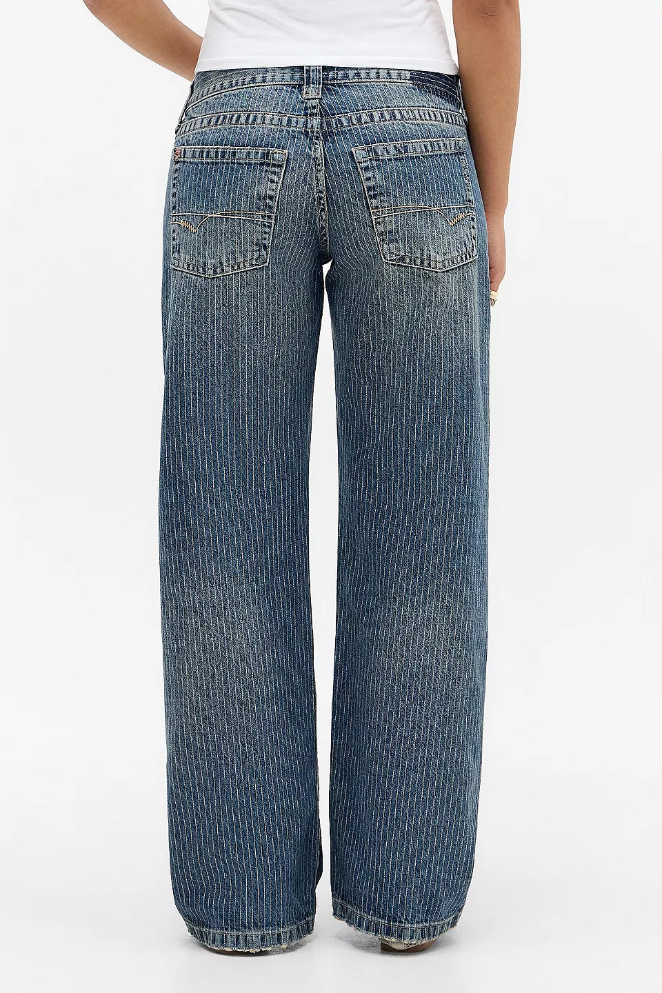 An update on the slouchy boyfriend jeans, the Kayla by BDG are a low-slung pair with a relaxed, straight fit through the leg. Pinstripe denim jeans with a low-rise waist, front zip and button fastening, belt loops, five-pocket styling with a metal logo tab on the coin pocket and a casual fit through the leg. Only at UO.