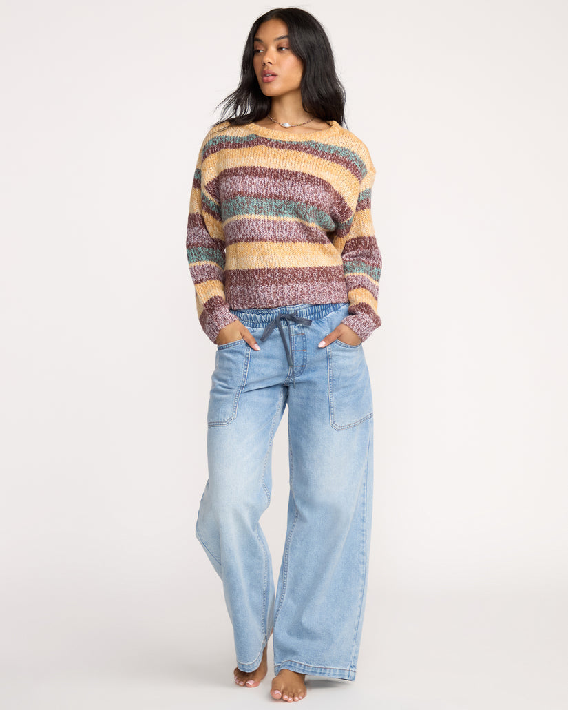 This relaxed-fit sweater rocks a space dye stripe pattern that catches every eye in the room. The wide neckline and acrylic knit keep you cozy while a metal plate detail adds the perfect finishing touch. Featured here in the Multi colorway.