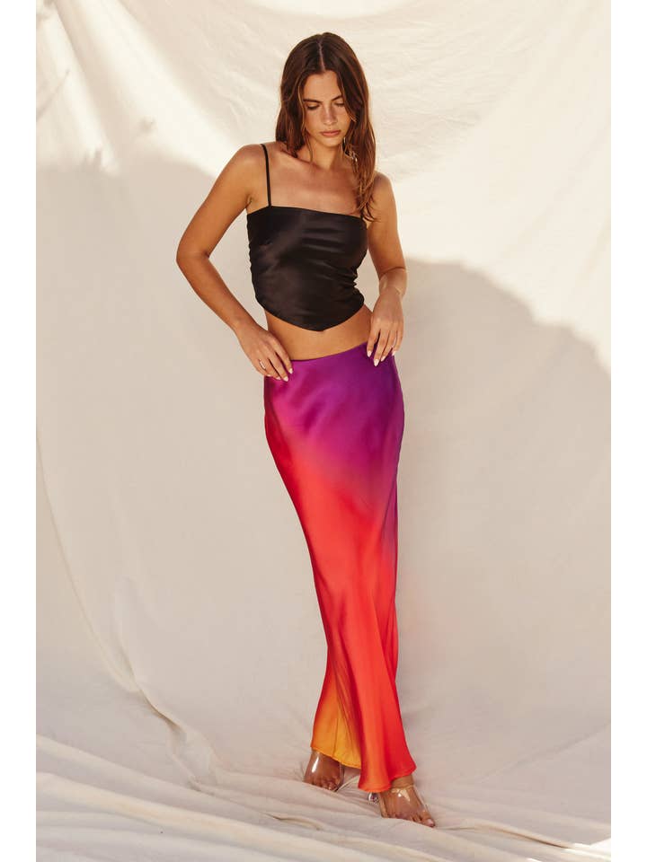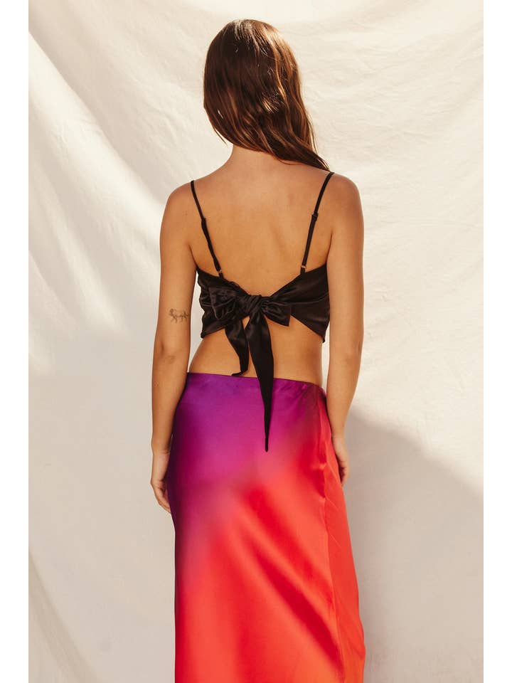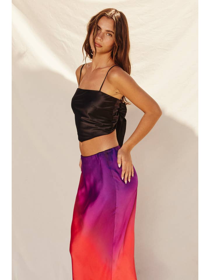 Straight neck cami top with a back tie closure, adjustable spaghetti straps, and a pointed hem. Model is 5'9" and is wearing a size Small.