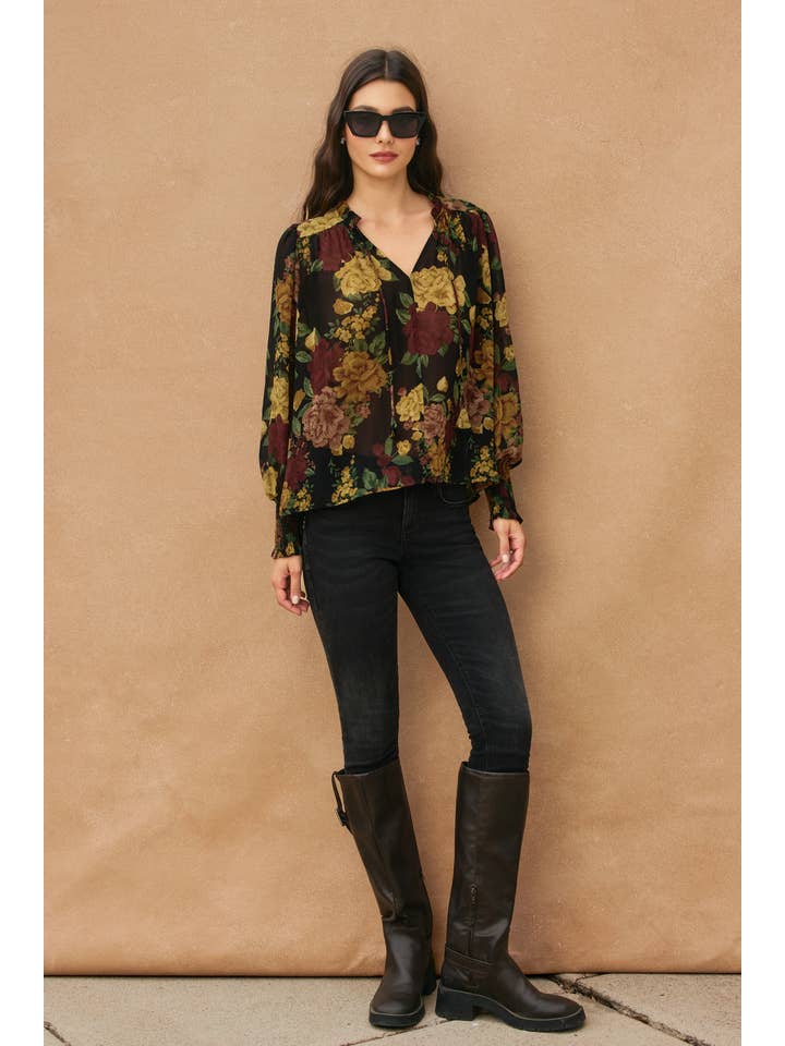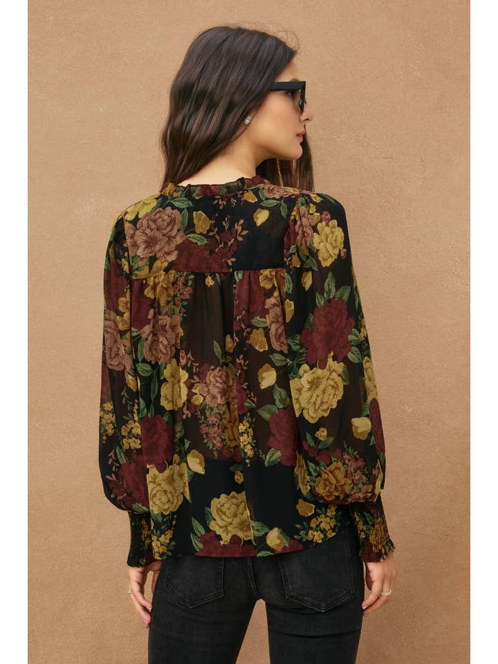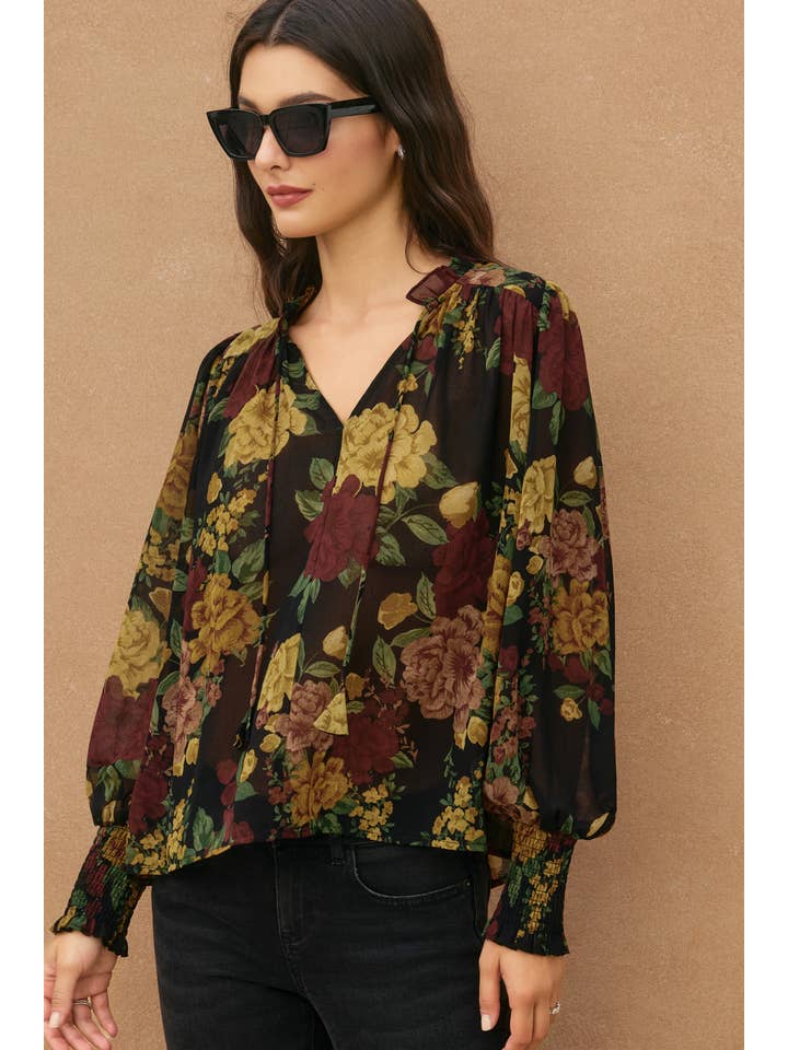 Floral print chiffon long sleeve blouse. Model is 5'9" and wearing size Small. - V neckline - Long bubble sleeves - Ruffled detail at neckline with string tie - Smocking on the sleeve opening - Unlined Shell: 100% Polyester