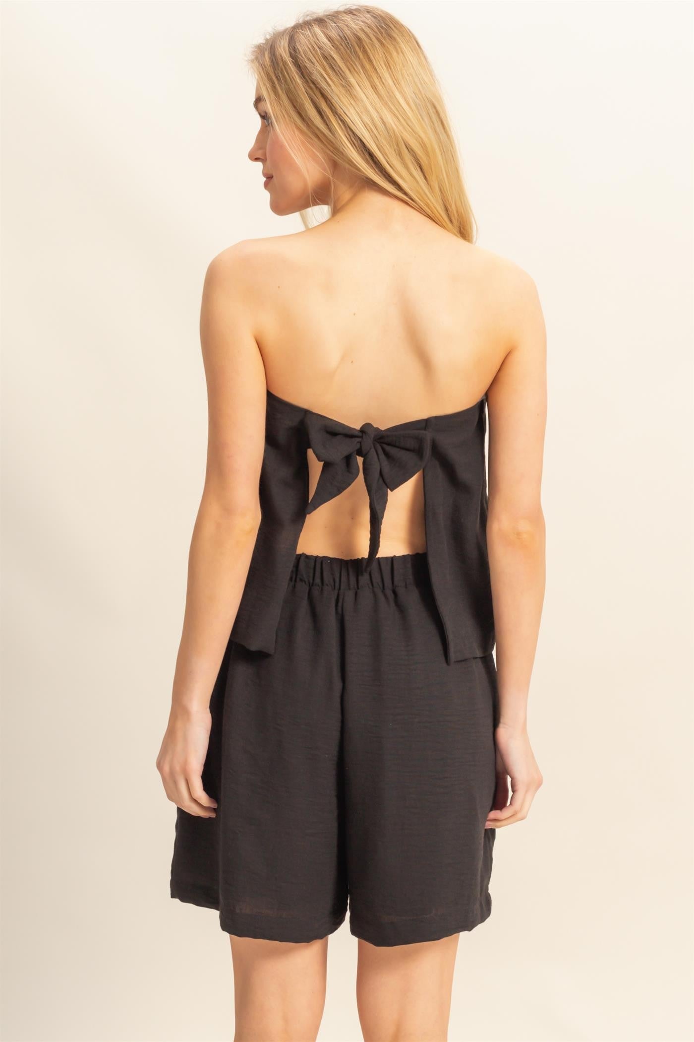 - Tube Top: Strapless neckline with a relaxed silhouette, open back, and bow tie detailing for a playful finish.