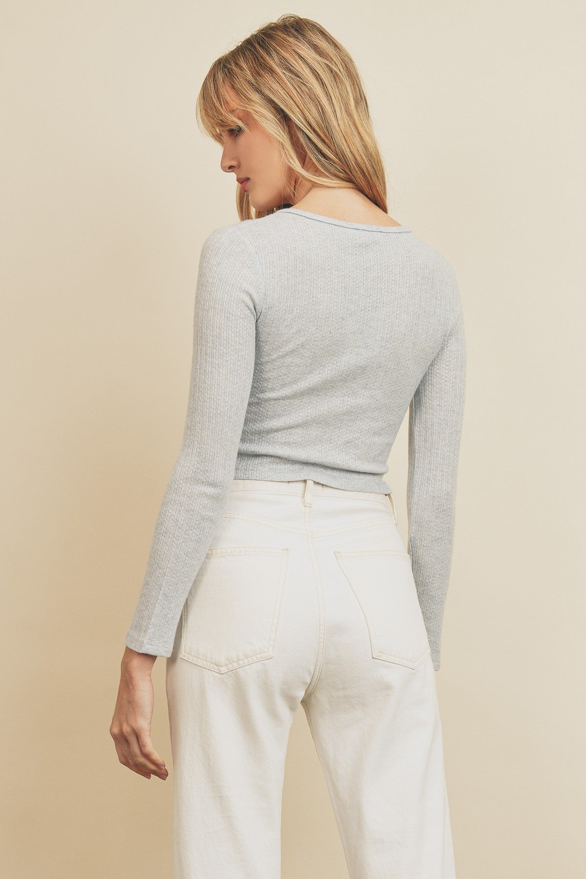 - Design details: long sleeves, ribbed texture, and a flattering crop length with a stylish split at the scoop neckline.