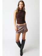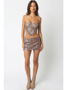 The Mya Sequin Mini Skirt features a zipper closure on the back and a low rise.