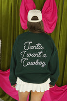 Bring some western charm to your holiday wardrobe. This green crewneck features a playful cowboy Santa with a lasso on the front, and “Santa, I Want a Cowboy” in rope-style font on the back.