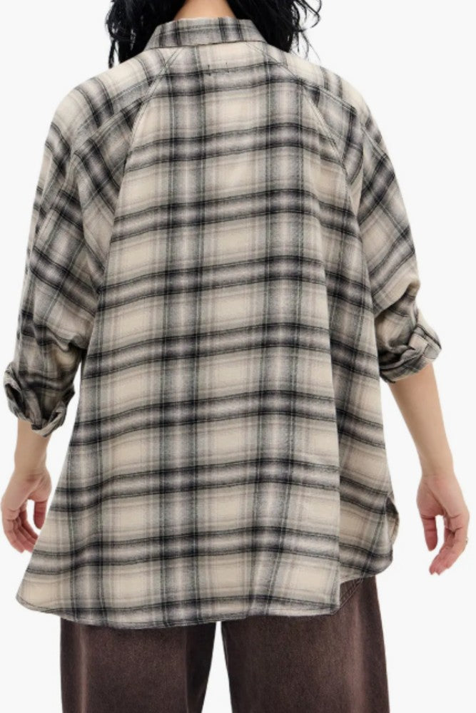 A long, oversized silhouette brings easygoing style to this check-pattern button-up shirt made from soft, lightweight woven fabric.