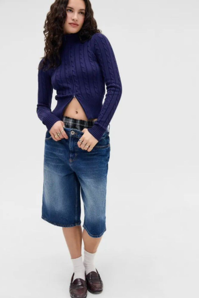 A two-way zipper gives a subtle retro vibe to this supersoft cardigan featuring dimensional cable stitches.