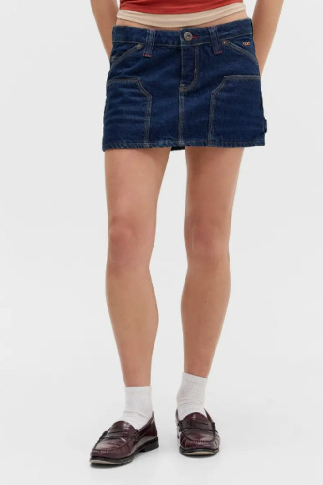 The wardrobe workhorse of Y2K makes a contemporary reappearance with this carpenter denim miniskirt boasting a crisp, dark wash.