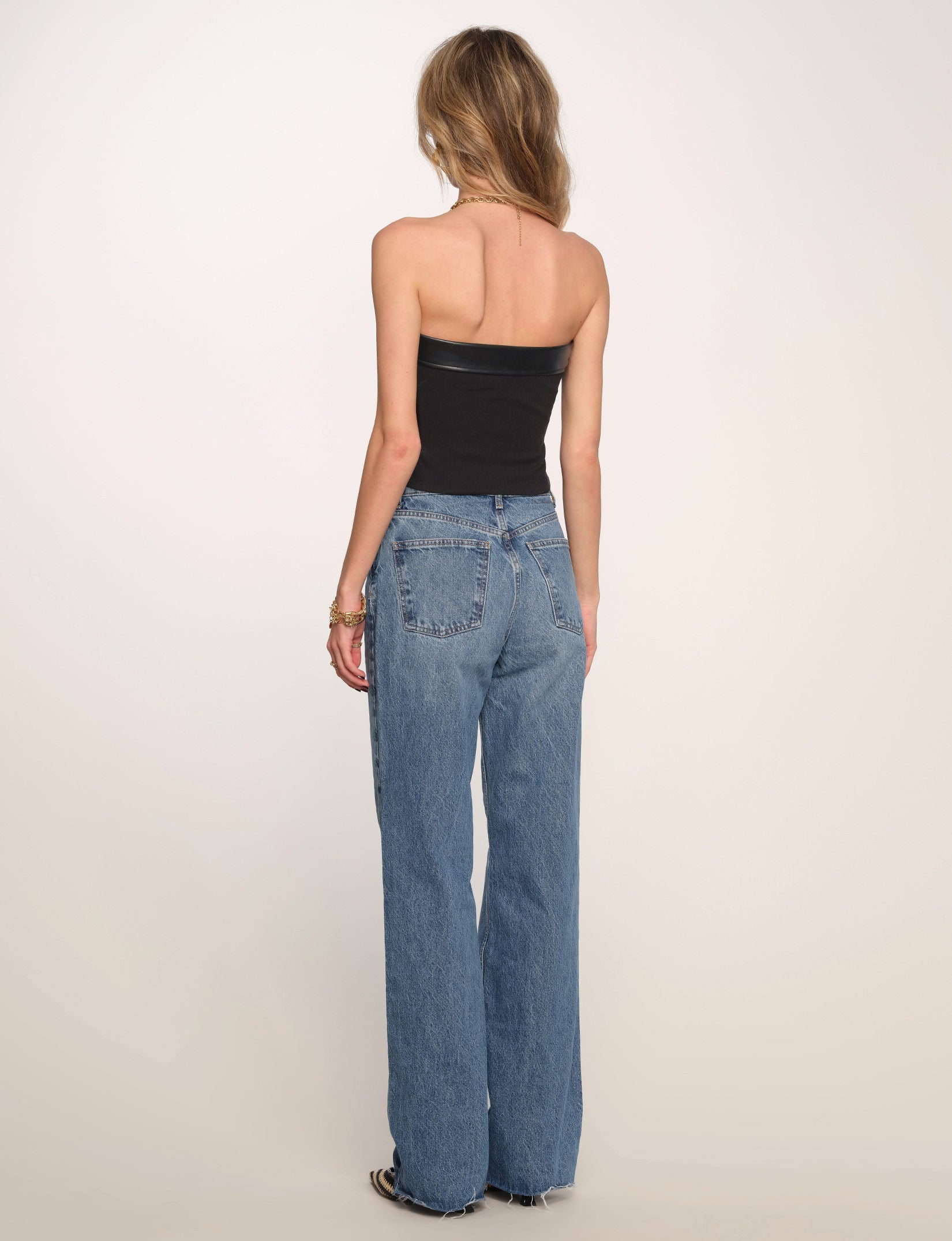 The Fern Top is a perfect strapless vest, made from faux leather. Its contrast rib back allows for great fit. Wear it with your favorite pair of vintage jeans.