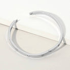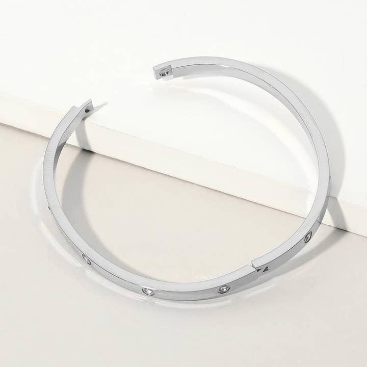 • Size : 0.1" H, 2.25" D • Hinged Closure • Elegant stainless steel bangle featuring subtle engraved accents for a sleek, modern look. Designed for both durability and style, this timeless bracelet is perfect for layering or wearing solo, making it an ideal accessory for any occasion. • Lead and Nickel Compliant • Stainless Steel